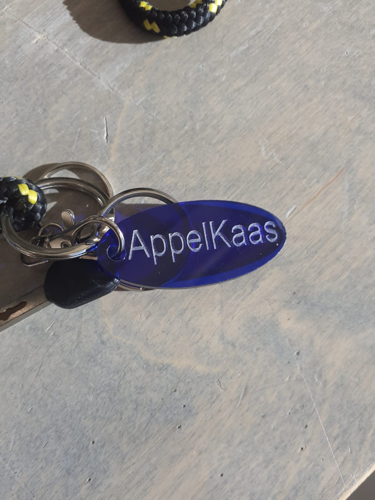 Deze sleutelhanger heb ik gemaakt met de lasercutter. Zelf hoefde ik niet veel te doen. De vorm was namelijk al gemaakt voor mij. De bedoeling was eigenlijk om je eigen naam erop te zetten. Maar dat vond ik eigenlijk best wel saai. Ik vroeg aan Mevrouw Buis of ik er ook wat anders op mocht zetten. Zij vond het goed. Ik dacht toen aan de eerste twee woorden die in mij opkwamen, plakte die aan elkaar en daar was dan het woord dat op mijn sleutelhanger zou komen: AppelKaas. Ik drukte op Start en het apparaat begon toen mijn sleutelhanger te maken. Ik wist na deze les wat een Lasercutter is en hoe ik hem moet gebruiken. Al met al vond ik het een erg leuke ervaring en hoop ik snel weer met de lasercutter te werken.