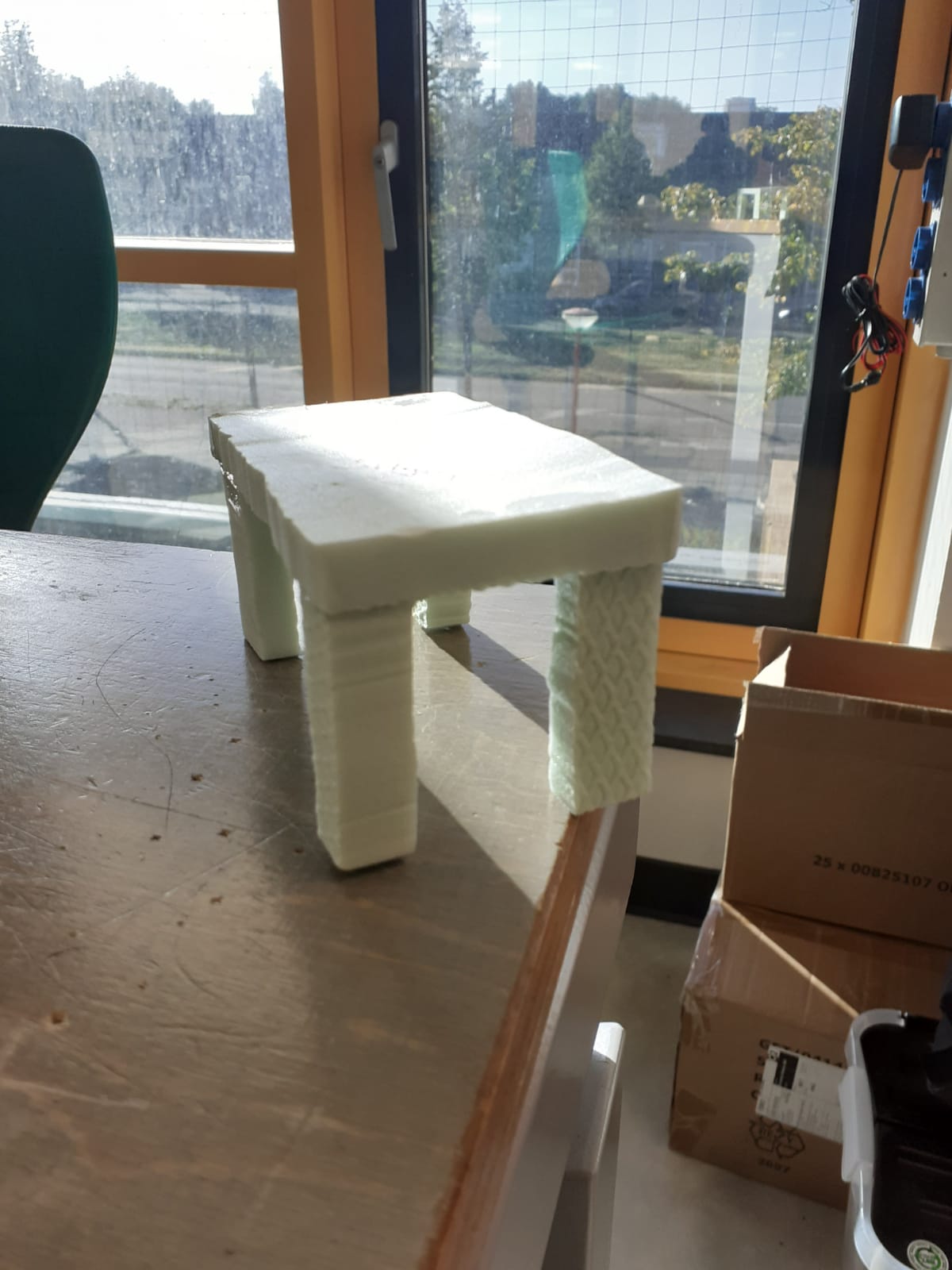 Deze tafel heb ik gemaakt met de Foamcutter. Een Faomcutter is een apparaat met een ijzeren draadje dat heel heet kan worden. Dat draadje wordt dan zo heet dat je ermee door schuim kan snijden. We moesten het schuim dus zo snijden dat we tafelonderdelen hadden. Voordat je dat kon doen moest je eerst een schets maken van de tafel die je ging snijden. Dat verliep bij mij best wel soepel. Ik kon daarna dus echt de tafel gaan maken. Ik moest eerst wel even wennen aan het apparaat, maar toen ik eenmaal wist hoe alles werkte ging het mij best gemakkelijk af. Toen ik alle onderdelen had gemaakt moest ik ze alleen nog aan elkaar vastlijmen en dan was mijn tafeltje klaar. Ik wist na deze les wat een Foamcutter is en hoe ik hem moet gebruiken.